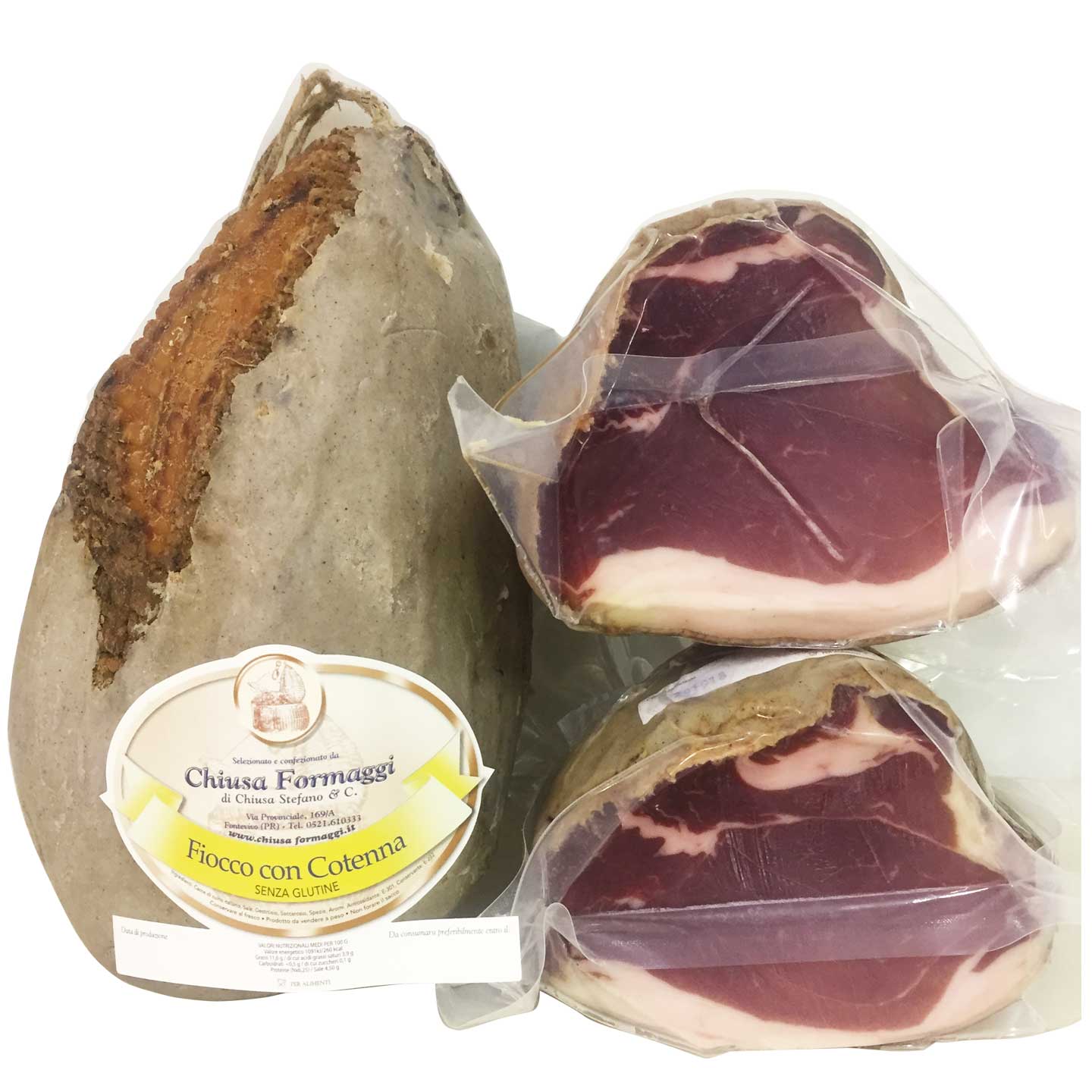 Il fiocco con cotenna è un salume magro e dal sapore delicato. Come per tutti i prodotti della nostra azienda, anche in questo caso, la materia prima viene accuratamente selezionata in modo da poter rispettare i nostri standard qualitativi. Viene utilizzata la parte anteriore della coscia di suino, chiamata appunto Fiocco. La stagionatura avviene in cantine che andranno a valorizzarne il profumo e il delicato sapore.