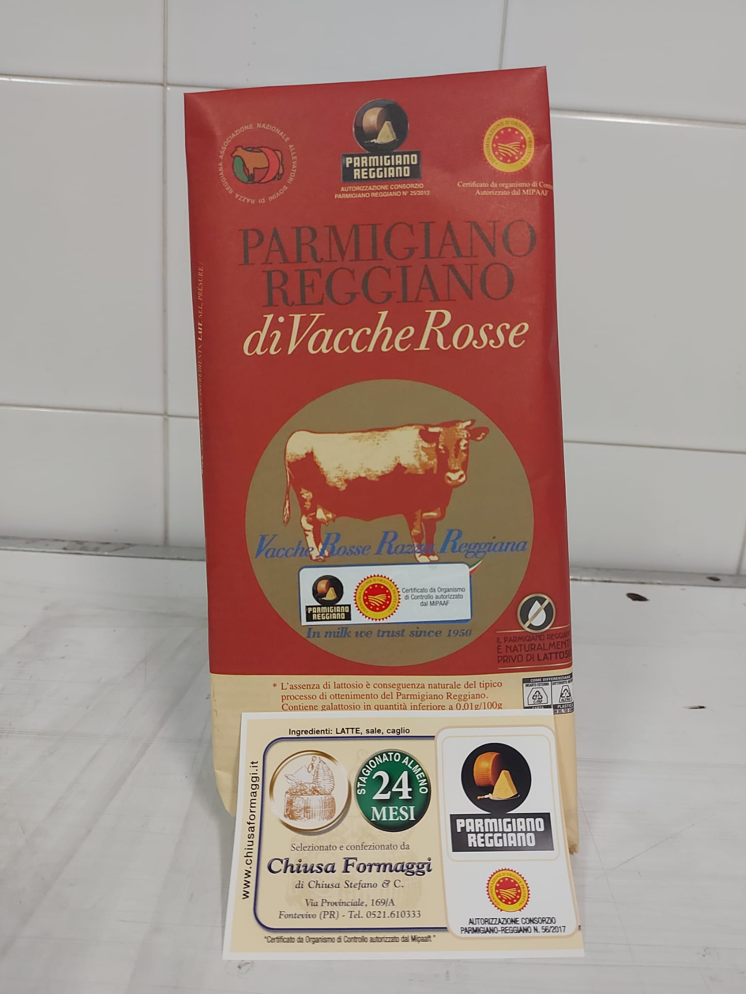 Parmigiano Reggiano Vacche Rosse 24/30 mesi porzionato, prodotto con latte di Vacche Rosse di Razza Reggiana alimentate esclusivamente con erba, fieno e mangimi certificati no OGM.